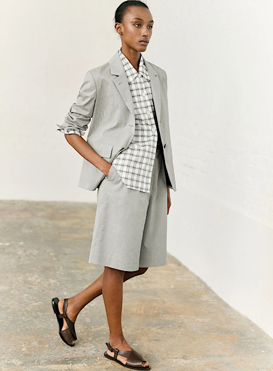La question des chaussures est également primordiale. Porté à plat, le bermuda fonctionne très bien lorsqu'il reste léger, assez court et associé à des sandales fines, des mules, des slingbacks ou des baskets. Dès qu'il s'allonge, s'étoffe ou prend un style "tailleur", un petit talon devient souvent utile pour redonner de la verticalité.